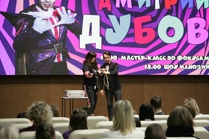 После мастер-класса для детей иллюзионист Дмитрий Дубов, известный зрителям как участник телепередачи «Петросян-шоу», представил свое шоу иллюзий. В этот вечер он стал для гостей библиотеки персональным гидом в мир магии и волшебства.