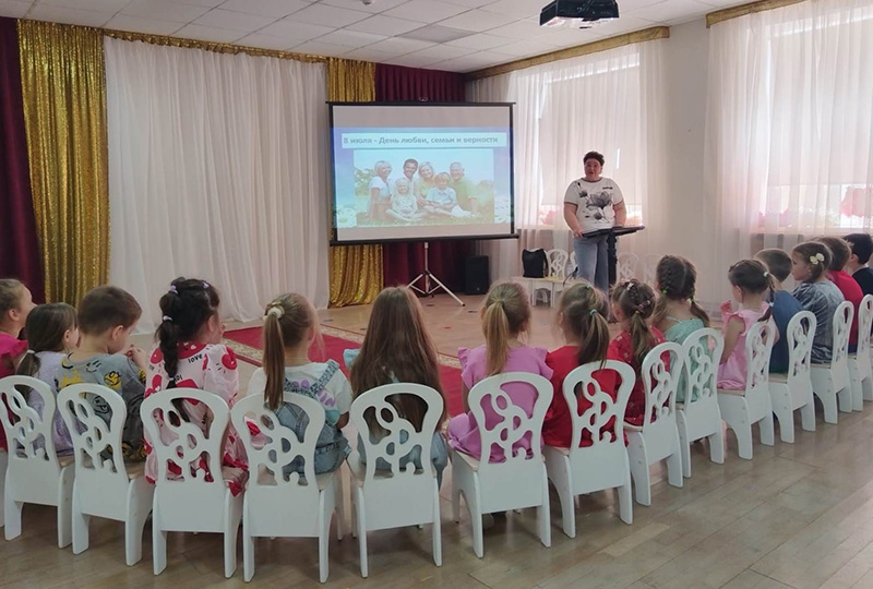Дети узнали о православных святых Петре и Февронии Муромских, о празднике семьи, любви и верности. Просмотрели мультфильм о родословной и получили домашнее задание – составить генеалогическое древо своей семьи. Ребята с большим удовольствием рассказывали о традициях в своей семье, отгадывали загадки и ребусы. Малыши поучаствовали в пантомиме сказок «Репка» и «Три медведя», осмысливая характеры персонажей. Тема семейных ценностей оказалась доступной и понятной для дошколят, атмосфера мероприятия была радостной, наполненной смехом и добрыми пожеланиями. В конце игры дети получили сладкие призы.