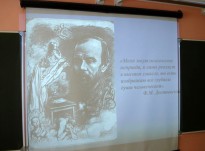 Учащиеся познакомились с биографией писателя, с его взглядами на добро и зло, на человека, пребывающего в мире социальных и духовных противоречий; узнали, почему внутренний мир его героев так драматичен. Мероприятие сопровождалось показом отрывков из фильмов, снятых по мотивам произведений Достоевского.