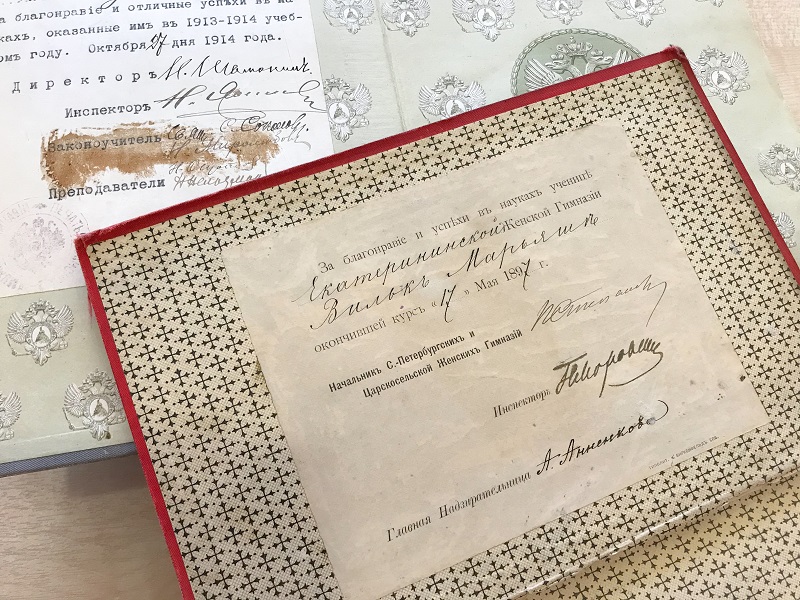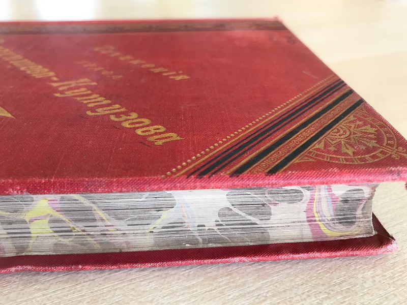 Роскошный том «Сочинений графа А. Голенищева-Кутузова» (СПб., 1894) – подарок воспитаннице Екатерининской женской гимназии Марьяше Вильк (1879–1955) – дочери часового мастера, купца 1-й гильдии Залмана Абрамовича Вилька, владевшего ювелирным магазином-мастерской на углу Вознесенского проспекта и Садовой улицы в Санкт-Петербурге. Подарочное издание в типографском коленкоровом переплете с золотым тиснением и мраморным обрезом преподнесено девушке по случаю успешного окончания гимназического курса 17 мая 1897 года.