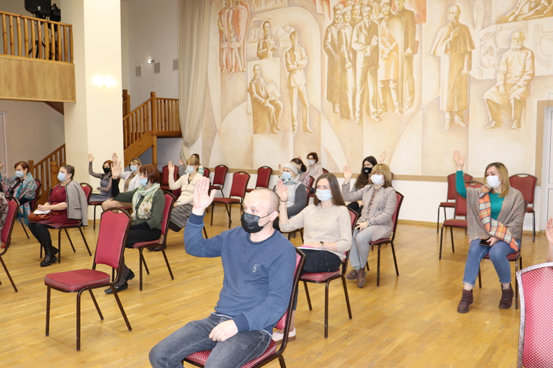 На повестку были вынесены три вопроса: отчет председателя профкома Ольги Уласевич о работе профкома за год, отчет инженера по охране труда Натальи Пилатовой об обеспечении безопасных условий труда в период пандемии, избрание нового председателя профкома. В работе собрания приняла участие директор библиотеки Наталья Гришина.