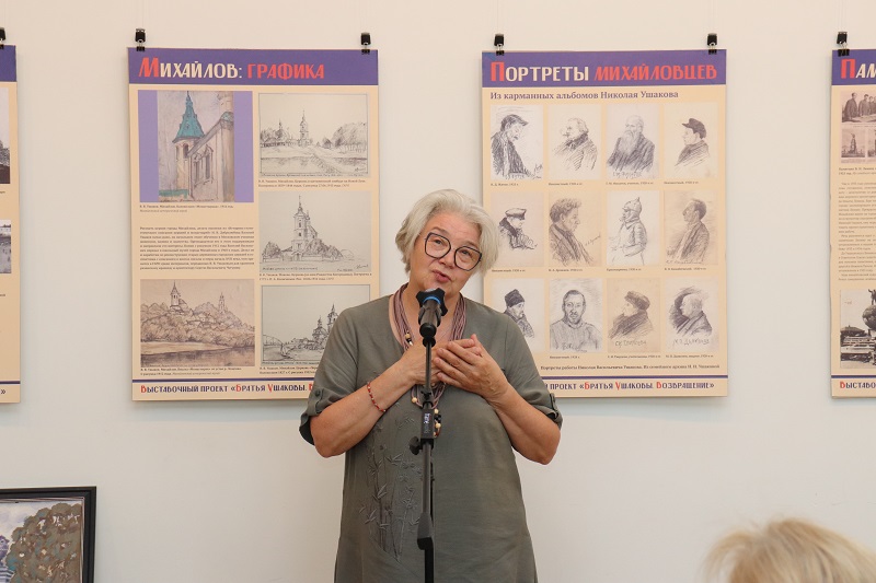 Искусствовед Екатерина Николаевна Андреева-Пригорина, почетный член историко-культурного общества «Московские древности», преподаватель Государственной академии славянской культуры, выступила с приветствием от своего отца – 96-летнего художника и краеведа Николая Васильевича Андреева, автора книги «Река времен» о его родном городе Михайлове, ученика Н. В. Ушакова, друга и соавтора по краеведческим статьям Н. Н. Ушакова, с радостью откликнувшегося на открытие выставки своих давних учителей и знакомых.