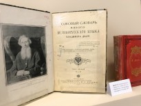 Среди экспонатов – один из крупнейших словарей русского языка «Толковый словарь живого великорусского языка», составленный Владимиром Далем в середине XIX века, содержащий около 200 000 слов и 30 000 пословиц, поговорок, загадок и присловий. За этот труд в 1863 году ученый был удостоен Ломоносовской премии и звания почетного академика Петербургской Академии наук.