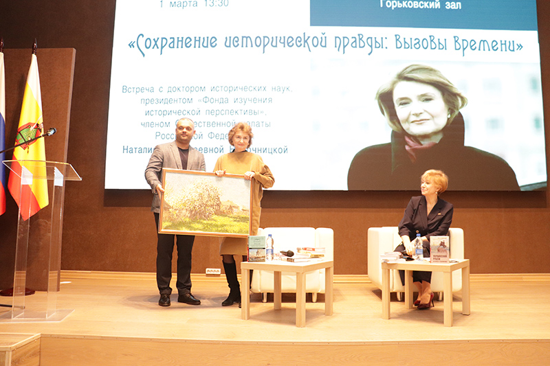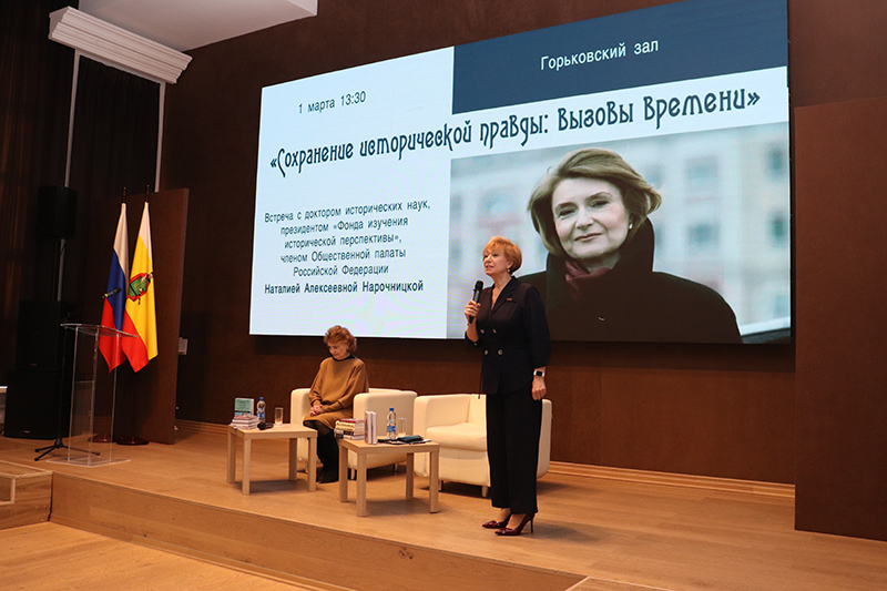 1 марта в Рязанской областной библиотеке имени Горького состоялась встреча с доктором исторических наук, президентом «Фонда изучения исторической перспективы», членом Общественной палаты РФ Наталией Алексеевной Нарочницкой. Для открытой беседы была выбрана тема «Сохранение исторический правды: вызовы времени». В Горьковском зале библиотеки собрались рязанские общественные и культурные деятели, ветераны войн, ученые-историки, преподаватели рязанских вузов и школ, аспиранты, студенты, литераторы, журналисты, художники, волонтеры Победы.