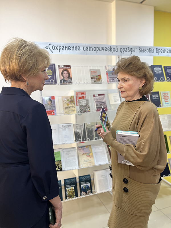 Все гости мероприятия смогли познакомиться с книжной выставкой «Сохранение исторический правды: вызовы времени», на которой были представлены книги, написанные самой Натальей Нарочницкой, ее знаменитым отцом, советский ученым-историком, академиком Алексеем Леонтьевичем Нарочницким, и матерью – Лидией Ивановной, участницей Великой Отечественной войны, исследователем внешней политики России. Наталия Алексеевна передала в дар библиотеке свои книги и ряд новейших изданий, осуществленных «Фондом изучения исторической перспективы».