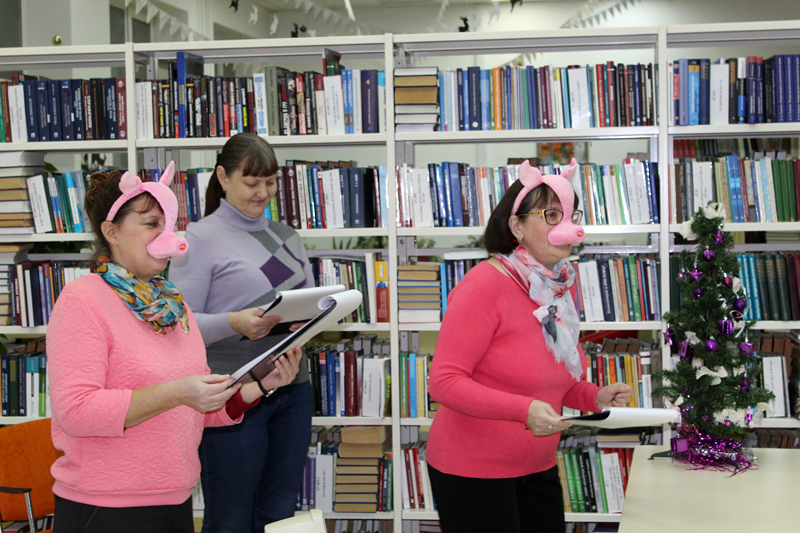 Сегодня библиотекари перевоплотились в поросят Чуню и Хрюню (очаровательная свинка – символ 2019 года) и мастерили с ребятами новогоднюю открытку. Дети с восторгом отгадывали зимние загадки, смотрели мультфильм про поросенка Чуню и танцевали вокруг елки.