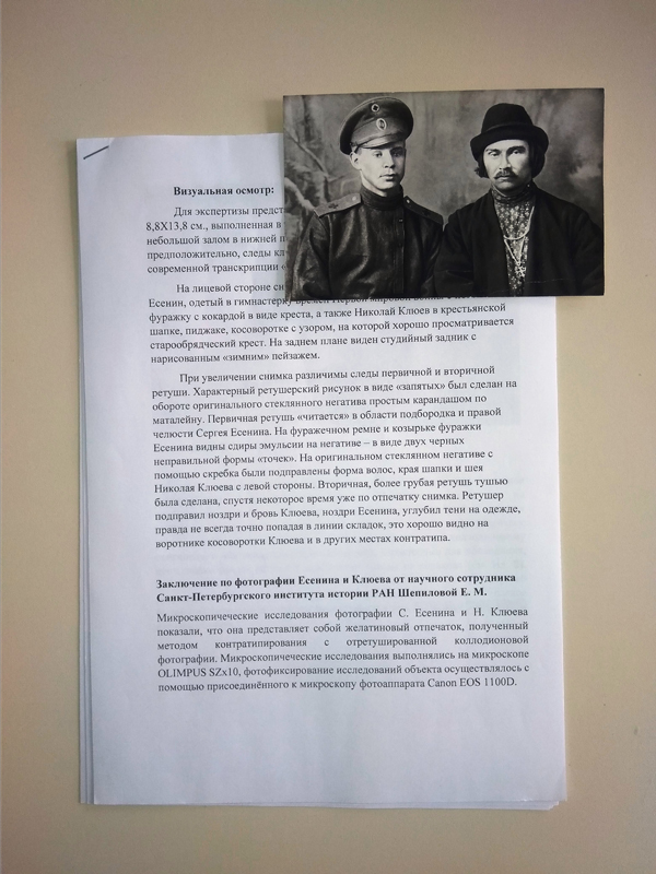 Особо ценной для нас стала копия (пересъемка) фотографии Сергея Есенина и Николая Клюева с оригинального авторского отпечатка 1916 года. К фотографии прилагается экспертное заключение от научного сотрудника Санкт-Петербургского института истории РАН Елены Шепиловой.