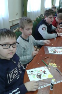 С большим удовольствием юные гости библиотеки мастерили открытки «Кошка на окошке» и аппликации из природных материалов «Птицы родного края».