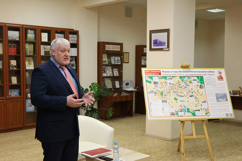 Он представил исторические карты-схемы «Рязань в годы Великой Отечественной войны» и «Оборона Рязани», рассказал о том, что в ходе осенне-зимней кампании 1941 года, через пять месяцев после начала Великой Отечественной войны, территория Рязанской области во время Московской битвы стала ближайшим прифронтовым тылом, а затем и театром военных действий.
