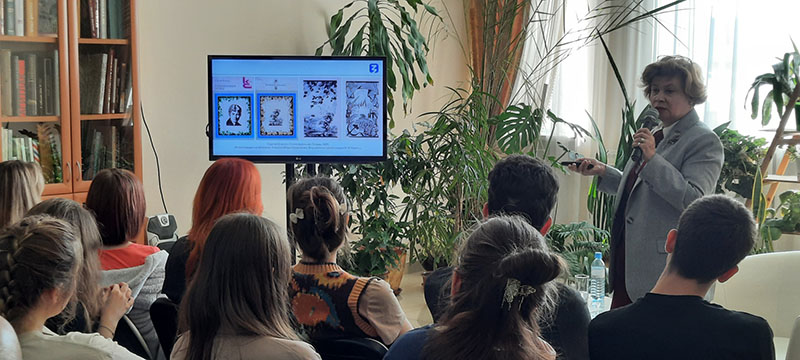 Каждый портрет Есенина – отражение какого-то момента его жизни, фрагмент яркой творческой биографии. При жизни поэта было создано около 30 его изображений. Слушатели узнали о работах художников разных лет – от работ современников Есенина – А. Бенуа, В. Юнгера, Б. Григорьева, а также известных работах С. Якушевского, А. Яр-Кравченко, Л. Шарлемань до произведений наших современников. Юлия Михайловна показала разнообразие образов поэта и отражение в них знаковых моментов его жизни, рассказала истории возникновения некоторых художественных произведений, продемонстрировала примеры книжной графики, живописи.