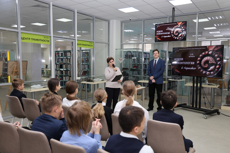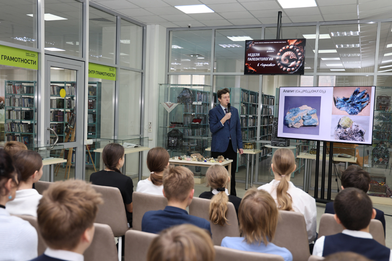 4 декабря в рамках Недели палеонтологии в библиотеке состоялась интерактивная лекция известного палеонтолога Алексея Валентиновича Пахневича «Путешествие в мир окаменелостей и минералов» для учащихся гимназии № 2.
