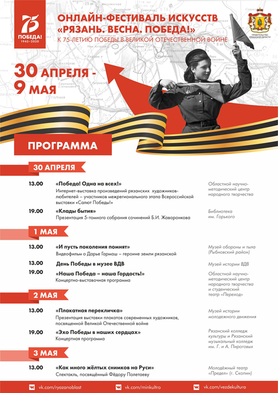 В преддверии знаменательной даты, 75-летия Победы советского народа в Великой Отечественной войне 1941-45 гг. Правительство Рязанской области и министерство культуры и туризма региона объявляет старт онлайн-фестиваля искусств «Рязань. Весна. ПОБЕДА!».