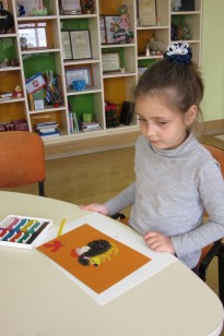 На этот раз нашим постоянным посетителям предстояло сделать очаровательного «Ёжика в осеннем лесу». Особенность этой поделки, помимо удивительной простоты выполнения, состоит в том, что в ней используется сразу несколько техник, развивающих мелкую моторику: вырезание, аппликация, пластилинография и работа с природным материалом. И, разумеется, фантазия наших участников ничем не ограничена – они могут добавить к поделке любые элементы на свой вкус. Так, Кира решила, что по дороге домой обязательно соберёт красивые жёлтые листья и добавит их к получившемуся панно. Безусловно, это сделает его ещё красочней.