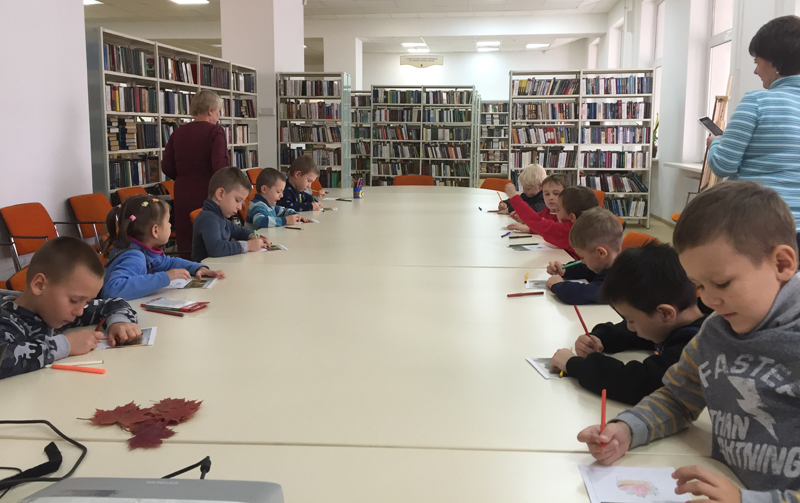 Знакомство со стихами А.С. Пушкина, Я.П. Полонского, С.А. Есенина и картинами И.И. Шишкина, И.И. Левитана, В.Д. Поленова, Е.Е. Волкова завершилось выразительным чтением. Дети с удовольствием декламировали стихи С.А. Есенина, день рождения которого мы отметили накануне. В завершение познавательного часа маленькие гости библиотеки с увлечением принялись украшать открытки, на которых были напечатаны отрывки из стихотворений и размещены репродукции картин с осенним пейзажем.