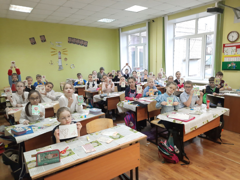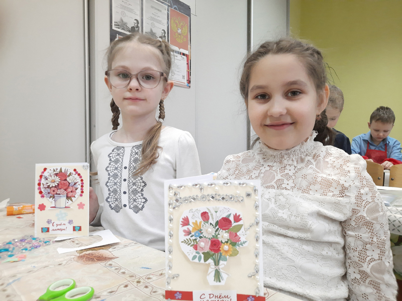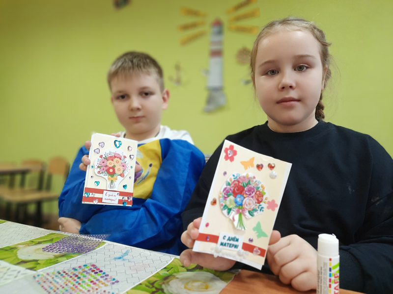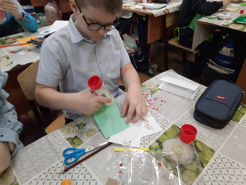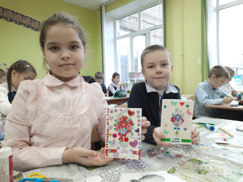 Мальчишки и девчонки вспоминали ласковые слова в адрес матерей, как можно проявить свою заботу, какие подарки будут уместны на этом празднике. Во время изготовления поздравительной открытки ученики старались сохранить структуру открытки, её композицию, баланс декоративных элементов.
