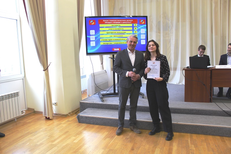 Наталья Николаевна Гришина, директор РОУНБ им. Горького, руководитель Общественной палаты Рязанской области и областного Совета женщин, приветствуя участников события, пригласила студентов стать общественными наблюдателями на выборах, подчеркнув важность активной жизненной позиции в молодом возрасте.