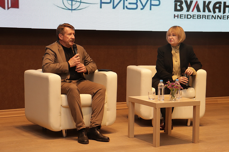После церемонии открытия выставки в Горьковском зале библиотеки состоялась творческая встреча. После просмотра короткометражного документального фильма режиссера Екатерины Шагаловой о В. Буте «Берег мой тонкой линией», Виктор и Алла Бут ответили на вопросы гостей.