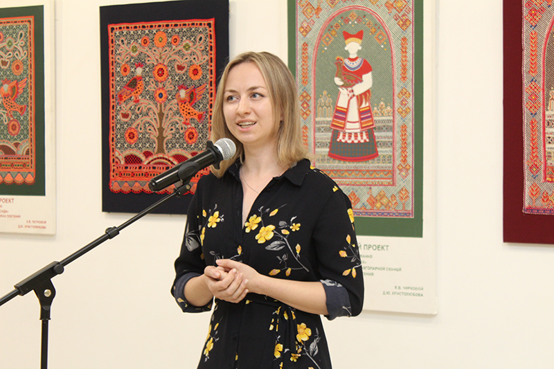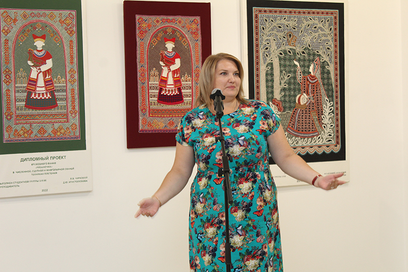 Подробнее о работах, представленных в экспозиции рассказала преподаватель отделения Художественного кружевоплетения Рязанского филиала Высшей школы народных искусств, кандидат педагогических наук Дарья Христолюбова. Дарья Юрьевна сказала, что выставка – это всегда яркое событие для мастериц. Каждая работа проходит большой путь. Тревожное время подготовки к защите курсового или дипломного проекта, волнительный этап защиты. Когда все тревоги остаются позади, нам хочется представить их широкой аудитории. Благодарность зрителей служит источником вдохновения и для преподавателей, и для студентов, даёт творческий заряд для продолжения творческого пути. Дарья отметила, что в своих работах преподаватели и студенты много экспериментируют, при этом сохраняя традиционные приемы.