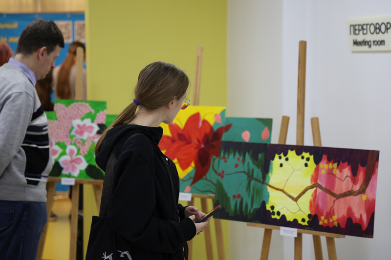 Выставка организована Рязанской областной библиотекой имени Горького совместно с Благотворительным фондом «Спасибо маме за жизнь». Заместитель руководителя Рязанского отделения благотворительного фонда Екатерина Анатольевна Печёрских рассказала о работе фонда и пояснила, что искусство может стать мощным инструментом для восстановления и самовыражения, оно открывает новые возможности для людей, которые столкнулись с трудностями.