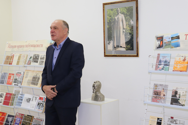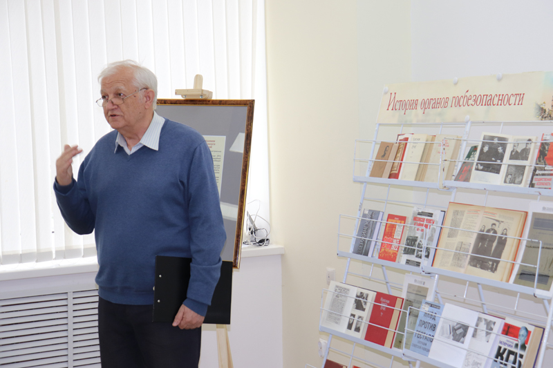 Николай Семенович Попов рассказал об экспонатах и книгах, представленных на выставке, а также об истории создания и деятельности ведомства в годы укрепления Советского государства, во время Великой Отечественной и холодной войн.