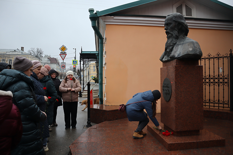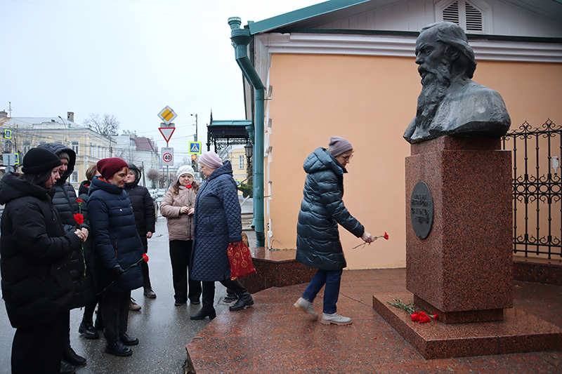 Участники митинга возложили цветы к подножию памятника писателю Михаилу Евграфовичу Салтыкову-Щедрину.