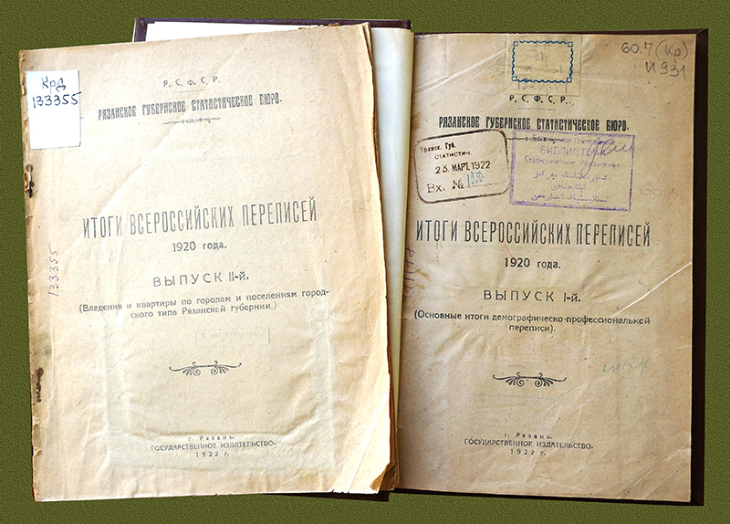 Доминирующее положение в книжном репертуаре занимали издания общественно-политической тематики. 28 августа 1920 г. стартовала первая в молодой республике Всероссийская перепись населения, которой было охвачено 72% жителей страны – в ряде районов еще велись военные действия, и кроме того, оставались местности, не подконтрольные центральной власти. Параллельно проводилась сельскохозяйственная перепись и учет промышленных предприятий. По итогам переписи населения Рязанское губернское статистическое бюро подготовило два справочных издания, которые вышли в Рязани в 1922 г. В первом выпуске были опубликованы основные итоги демографическо-профессиональной переписи, содержащие сведения о численности населения губернии с подразделением его по языковой принадлежности, возрастным группам, грамотности и национальности. Второй выпуск с подзаголовком «Владения и квартиры по городам и поселениям городского типа Рязанской губернии» стал результатом обработки материалов в части, относящейся к коммунальному хозяйству.
