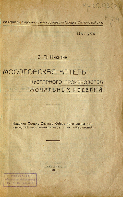 Рязанская земля издавна славилась народными традициями. Кустарные промыслы всегда занимали важное место в экономике нашей губернии. Наибольшее их количество приходилось на северные уезды, где производилась обработка дерева, развивались вышивание, вязание, сапожный, скорняжный и шорный промыслы. Около 8 тыс. кустарей вошли в состав Средне-Окского кустарьсоюза, созданного в мае 1921 г. для объединения и руководства работой потребительских и сельскохозяйственных кооперативов и организации новых артелей. В 1922 г. в серии «Материалы о промысловой кооперации Средне-Окского района» Союзом был издан доклад инструктора В. П. Никитина о Мосоловской артели кустарного производства мочальных изделий в Спасском уезде. В той же серии вышел доклад заведующей художественным и учебным отделом Средне-Окского кустарьсоюза С. И. Бобровой, в котором речь шла о кооперировании кружевниц в Рязанском, Михайловском и Скопинском уездах, об истории вышивального промысла и соломоплетения в Рязанской губернии.
