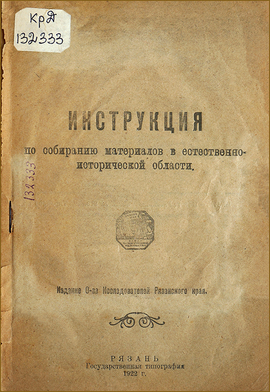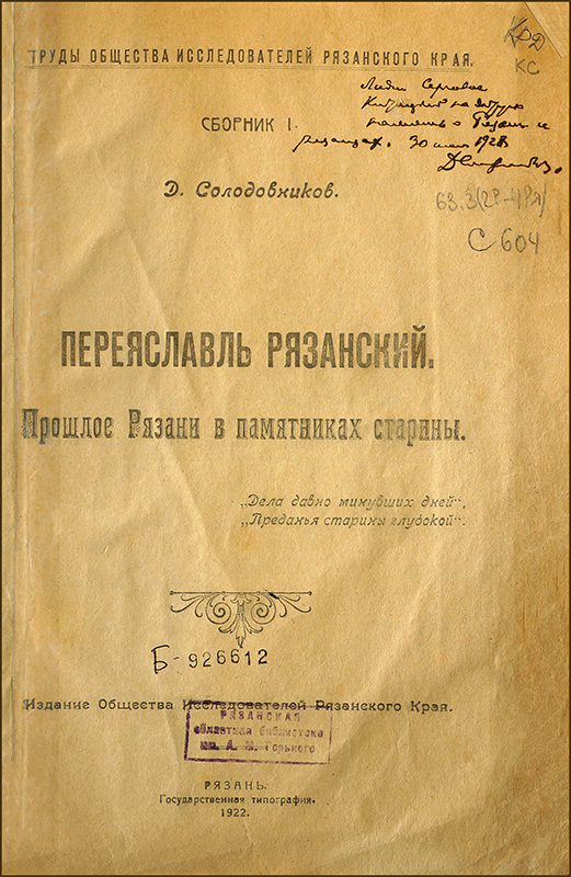 После Октября 1917 г. большой размах в стране приобрело краеведческое движение. В начале января 1920 г. в Рязани при Институте народного образования было создано Общество исследователей Рязанского края. Оно занималось изучением истории, экономики и географии Рязанской губернии, организовывало выставки и публичные лекции, печатало отчеты о своей деятельности – сначала в журнале «Вестник Рязанских краеведов» (1923–1925), а с 1926 г. – отдельными брошюрами. Общество издавало свои материалы по трем сериям. В нашей коллекции имеются первый выпуск из «Серии методической» – «Инструкция по собиранию материалов в естественноисторической области» (о сборе растений и насекомых, метеорологических и фенологических наблюдениях и исследованиях) – и первый сборник из серии «Труды» «Переяславль Рязанский. Прошлое Рязани в памятниках старины». Автор этой монографии – Дмитрий Дмитриевич Солодовников (1872 – 1944), фигура едва ли не самая удивительная в рязанском краеведении: талантливый педагог и популяризатор истории, организатор краеведческой и музейной работы. За обширные знания его называли «профессором Рязанского края». Он закончил работу над своей книгой в 1918 г., но издана она была только в 1922-м – под скромной обложкой, на дешевой бумаге, без иллюстраций. Для страны, только что пережившей тяготы Гражданской войны, был удивителен сам факт появления подобного издания. Книга знакомит читателя с различными эпизодами из истории Рязани (до 1778 г. – г. Переяславль Рязанский), начиная с древних археологических находок и существования Рязанского княжества и заканчивая губернским периодом XIX – начала XX вв. Написанная «для людей простых, не ученых», она доступно, хорошим литературным языком рассказывает о богатом историко-культурном наследии Рязани: памятных местах, церковной старине, архитектуре и исторических реликвиях, о городских меценатах и знаменитых земляках. Неустаревающее содержание труда «Переяславль Рязанский. Прошлое Рязани в памятниках старины» стало главным аргументом для его переиздания в 2016 г.