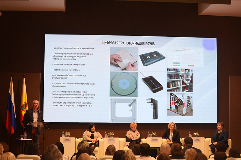 О цифровой трансформации государственных и муниципальных библиотек Рязанской области рассказал Олег Витальевич Лобан, заведующий центром «Школа креативных индустрий», кандидат технических наук, доцент РГРТУ им. В.Ф. Уткина. Он представил опыт Рязанской областной универсальной научной библиотеки имени Горького по внедрению RFID-технологий и сообщил о подготовке проекта штрихкодирования фондов библиотек региона.