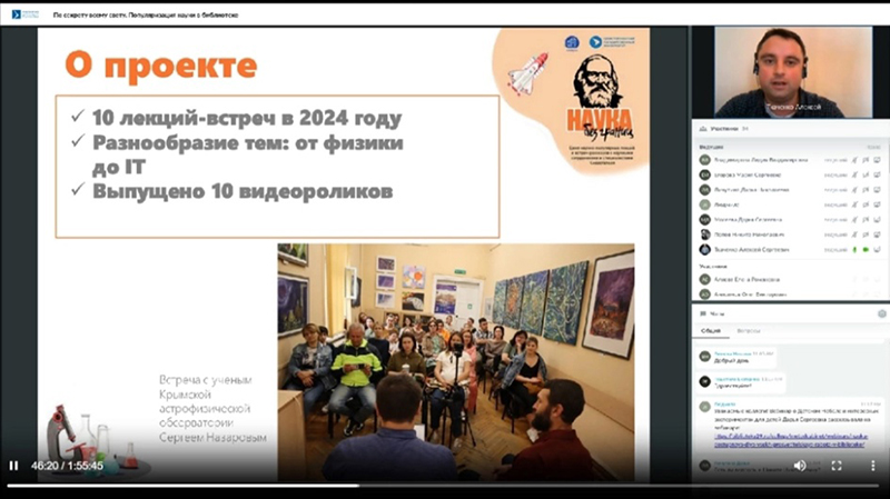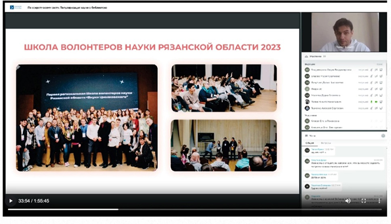 25 февраля состоялся первый вебинар – «Популяризация науки в библиотеке», где Никита Попов, заведующий региональным центром социокультурных проектов, рассказал о работе волонтеров науки в Рязанской области. Поделился со слушателями опытом проведения Первой региональной школы волонтеров науки «Внуки Циолковского», организации конкурса детских и молодежных изобретений «Научный-нескучный», создания в Рязанской области сообщества волонтеров науки на базе областной универсальной научной библиотеки имени Горького. Его доклад вызвал живой интерес аудитории.
