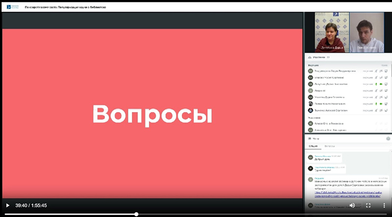 Вебинар еще раз подчеркнул необходимость использования современных технологий и интерактивных форматов в библиотеках для вовлечения широкой аудитории в научные процессы. Обсуждались возможности организации научно-популярных лекций, мастер-классов, выставок и квестов в библиотеках. Особое внимание было уделено роли библиотек в поддержке научных исследований и распространении достоверной научной информации.