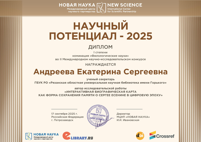 Андреева Екатерина Сергеевна, учёный секретарь ГБУК РО «Рязанская областная универсальная научная библиотека имени Горького», одержала победу в II Международном научно-исследовательском конкурсе «Исследователь года – 2025», заняв 1 место в секции «Филологические науки» с исследованием «Интерактивная биографическая карта как форма сохранения памяти о Сергее Есенине в цифровую эпоху».