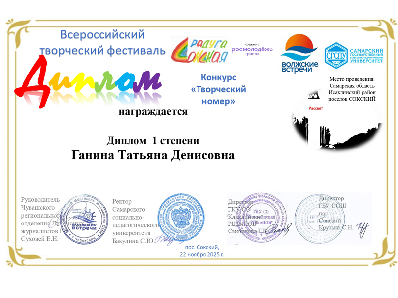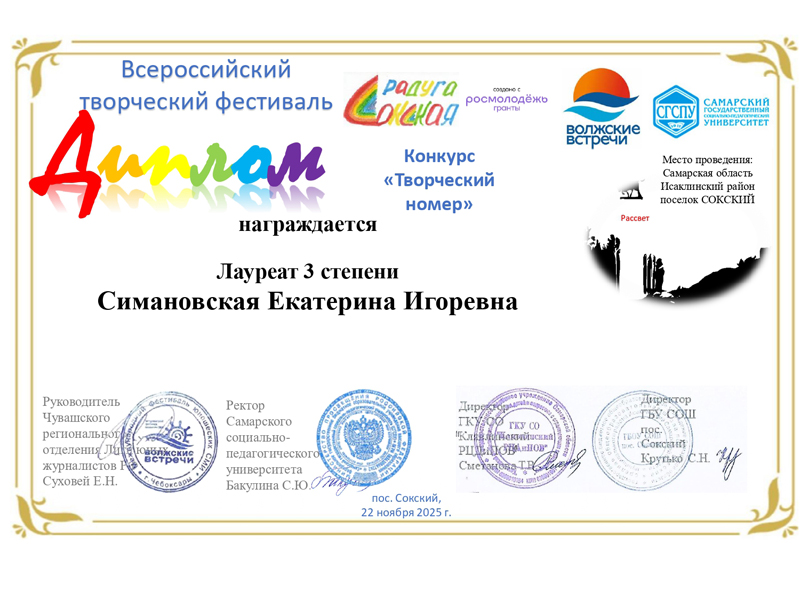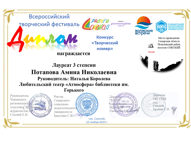 Участники клубного формирования «Любительский театр “Атмосфера”» отмечены дипломами Всероссийского творческого фестиваля «Сокская радуга» (Самарская область).