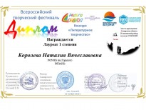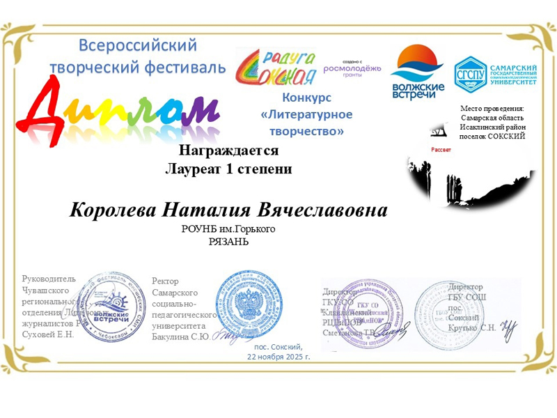 Дипломом лауреата I степени награждена также Наталия Королева в номинации «Литературное творчество».