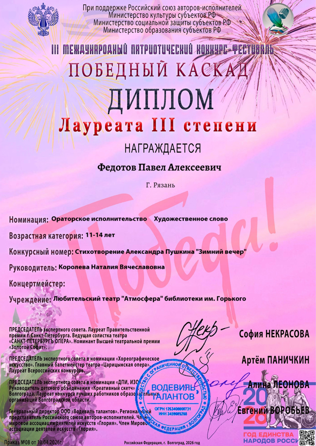 Лауреатом III степени стал Павел Федотов, он блестяще прочел стихотворение Александра Пушкина «Зимний вечер».