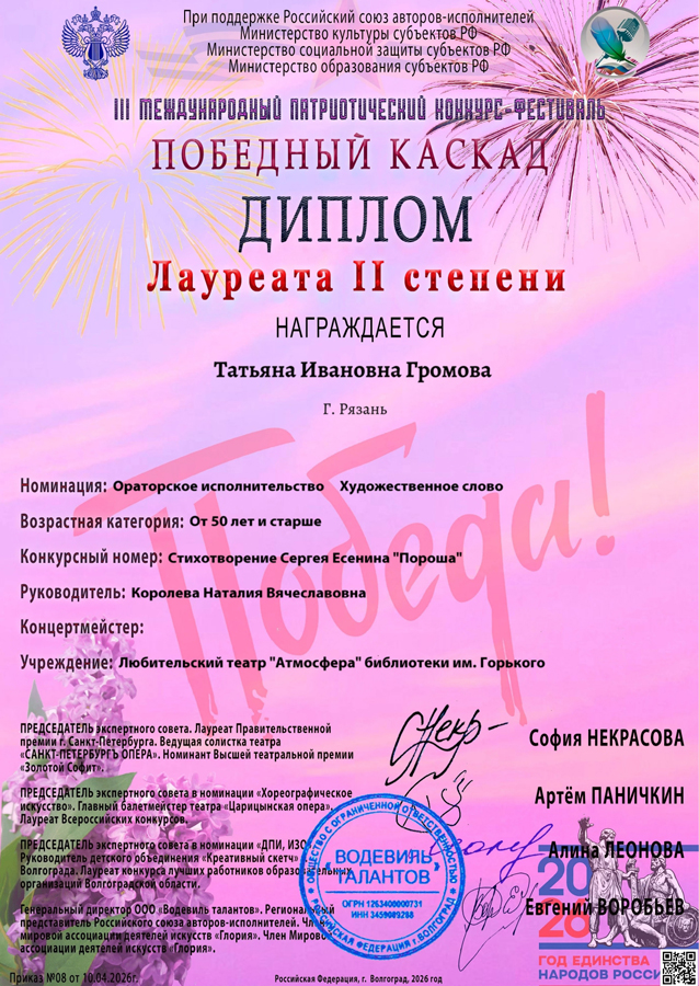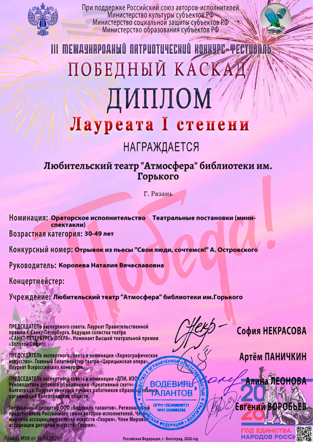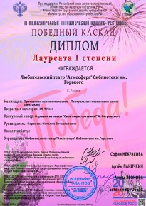 Артисты любительского театра «Атмосфера» библиотеки имени Горького приняли участие в III международном патриотическом конкурсе-фестивале «Победный каскад».