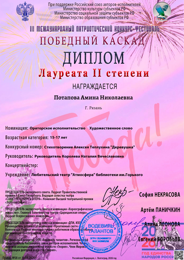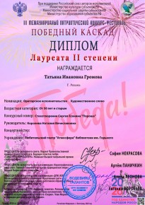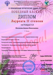 В номинации «Ораторское искусство» жюри высоко оценило выступления сразу двух артистов в разных возрастных категориях, удостоенных дипломов лауреатов II степени: Татьяна Громова покорила сердца слушателей проникновенным исполнением стихотворения Сергея Есенина «Пороша». Амина Потапова представила трогательную работу по произведению Алексея Теплухина «Деревушка».
