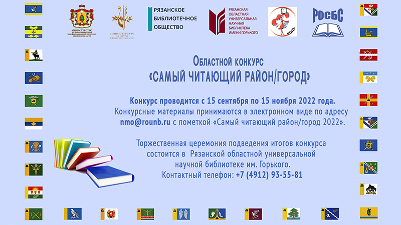 Рязанское библиотечное общество, Рязанская областная универсальная научная библиотеки имени Горького при поддержке министерства по делам территорий и информационной политике и министерства культуры Рязанской области реализовали проект – областной конкурс «Самый читающий район/город», в рамках подпрограммы «Поддержка социально значимой деятельности некоммерческих организаций» государственной программы Рязанской области «Развитие местного самоуправления и гражданского общества», который проводился с 15 сентября по 15 ноября 2022 года. В конкурсе приняли участие библиотеки из 21 муниципального района.