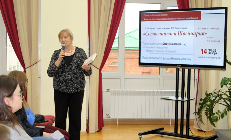 В библиотеке им. Горького в рамках продолжающегося сотрудничества с посольством Швейцарии в России, реализации проекта «Солженицын и Швейцария» и крупного просветительского библиотечного проекта «В пространстве Солженицына» состоялась презентация книги «Стойте в свободе…», которая посвящена Наталье Ивановне Столяровой, одной из тех, кто «невидимо» для остальных помогал Александру Солженицыну в непростое для него время.