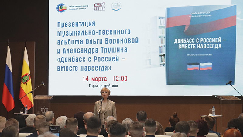 В библиотеке Горького состоялась презентация нового сборника Ольги Вороновой и Александра Трушина «Донбасс с Россией – вместе навсегда». Музыкально-песенный альбом, посвященный специальной военной операции и героической борьбе народа Донбасса, издан РОУНБ им. Горького при поддержке Правительства Рязанской области, Общественной палаты Рязанской области.