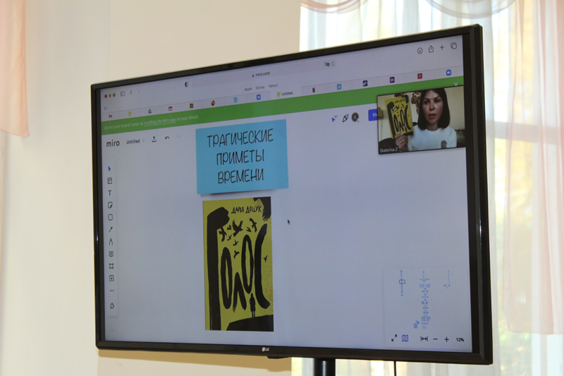 Писатель рассказала участникам встречи о книгах, в которых подняты темы изоляции, терактов и их последствий, экологические проблемы: «Тихие игры» Софьи Ремез, главные герои оказываются под домашним арестом, «Голос» Дарьи Доцук, героиня пережила теракт в метро и у неё начались панические атаки, «История Северного круга», где в результате экологической катастрофы мир поразила болезнь.
