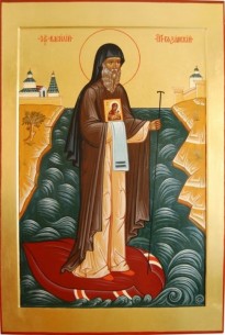 Невинный праведник всю ночь молился со слезами в Борисоглебском храме: совершив всенощное бдение, он утром отслужил Божественную литургию, затем в Благовещенском храме совершил молебен перед чтимой иконой Божией Матери. Взяв с собой эту икону и предав себя воле Божией, он пошел к реке Оке, снял с себя мантию, разостлал ее на воде и, встав на нее с образом Богоматери, поплыл вверх по реке, против течения.