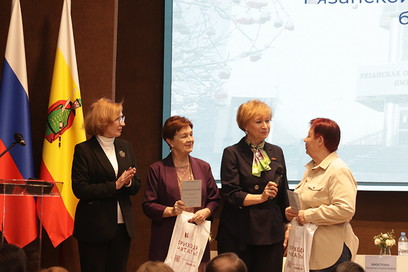 Директор библиотеки, председатель Общественной палаты Рязанской области, заслуженный работник культуры Российской Федерации Наталья Николаевна Гришина вручила свидетельства почетных читателей номинированным на это звание в 2023 году учителю химии средней школы поселка Варские Рязанского района, заслуженному учителю Российской Федерации Елене Николаевне Аграмаковой и активному читателю библиотеки и члену Клуба садоводов Наталье Александровне Пчелинцевой. Далее Наталья Николаевна выступила с обзором основных результатов деятельности библиотеки за 2023 год, особенно отметив положительную динамику количественных и качественных показателей работы трудового коллектива, расширение сотрудничества с организациями-партнерами и оказание шефской помощи библиотечному сообществу новых российских регионов. Достижения, ключевые задачи и перспективы дальнейшей работы библиотеки по сохранению духовно-нравственных ценностей и патриотическому воспитанию молодежи были рассмотрены в контексте итогов работы всей сферы культуры в 2023 году и в свете новых приоритетов деятельности российского государства, озвученных в Послании Президента России В.В. Путина Федеральному Собранию Российской Федерации.
