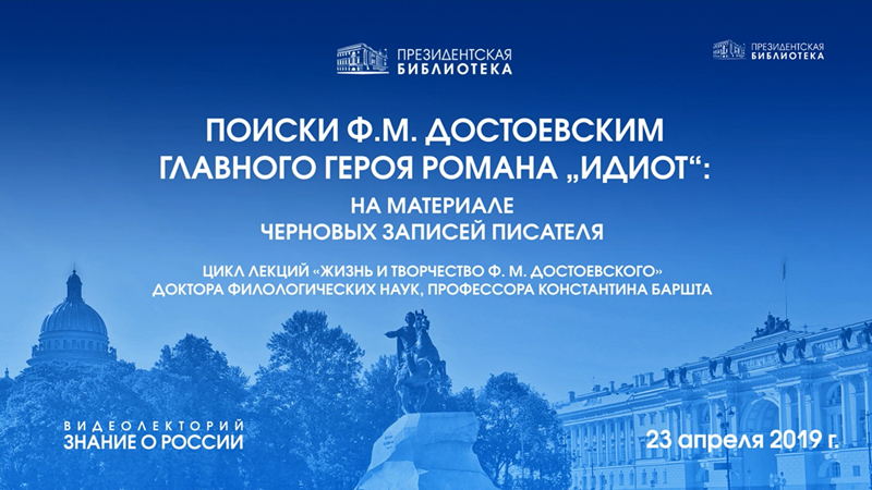 В рамках видеолектория Президентской библиотеки «Знание о России» состоялась третья по счету лекция из цикла, посвященного жизни и творчеству Ф. М. Достоевского. Тема этой встречи – «Поиски Ф. М. Достоевским главного героя романа «Идиот» на материале черновых записей писателя».