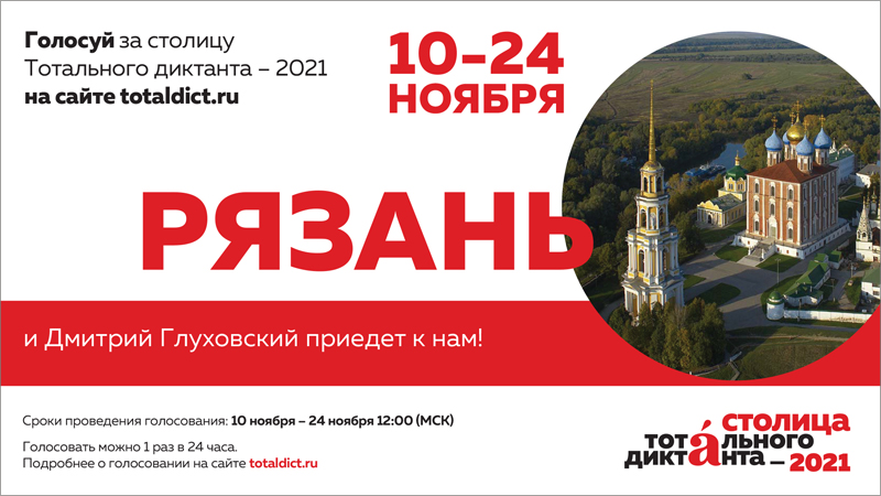 В случае победы Рязани, в апреле 2021 года город станет главной площадкой просветительской акции, здесь пройдет онлайн-марафон диктанта с участием ведущих лингвистов страны, писателей, экспертов филологии. Автор уникального текста «Тотального диктанта», чье имя стало известно на прошедшей в ТАСС конференции, российский писатель, журналист, сценарист, радиоведущий и военный корреспондент Дмитрий Глуховский продиктует задание из столицы проекта.
