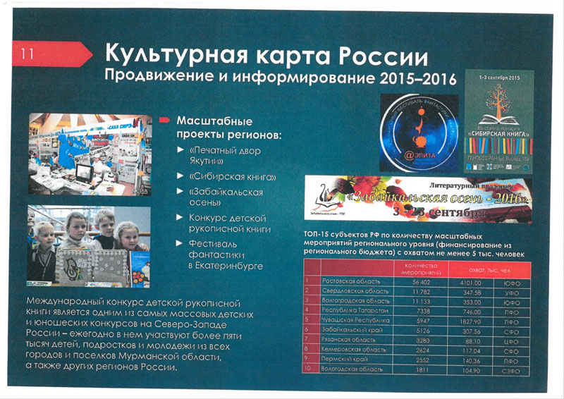 Президент Российского книжного союза Сергей Степашин рассказал о развитии проекта «Культурная карта России. Литература. Чтение» и назвал три ключевых показателя, на которых базируется рейтинг регионов: состояние книготорговой и библиотечной инфраструктуры, продвижение и информирование и литературный потенциал региона.