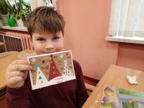 Мальчишки и девчонки с помощью бумаги и клея с удовольствием мастерили новогодние открытки. Материалы для работы были практически одинаковые, но каждая открытка получилась по особому яркой и интересной. Кто-то "засыпал" новогодние ели на открытке снежными сугробами из блесток и наклеек, а у кого-то был выдержан строгий и лаконичный стиль оформления. Результатом остались довольны все участники.