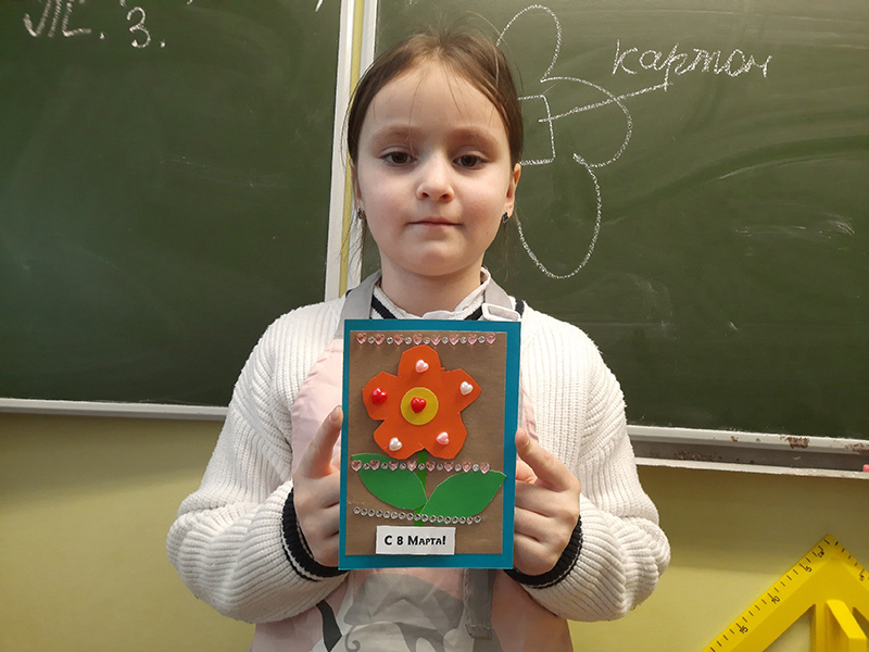 Героем открытки стал маленький цветок, который ребята вырезали по шаблону из цветного картона и украсили каждый по своему вкусу. Все работы мальчишки и девчонки сопроводили теплыми словами поздравлений в адрес своих близких.