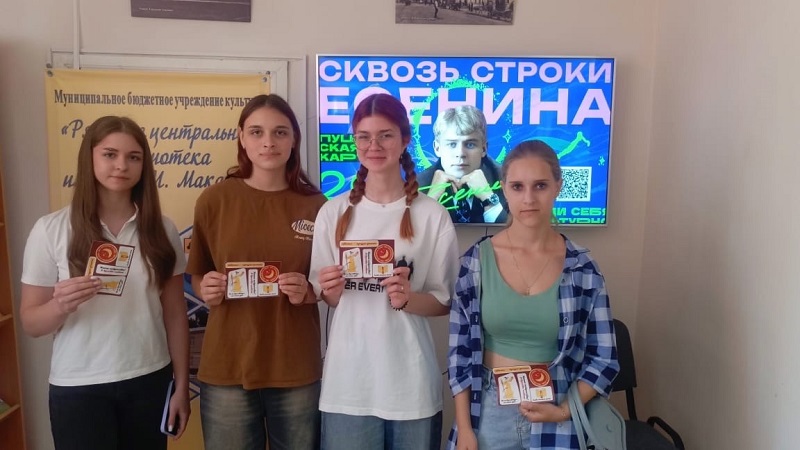 В Ряжской центральной библиотеке имени И.И. Макарова прошла литературная игра «Сквозь строки Есенина», организованная специалистами Рязанской областной универсальной научной библиотеки имени Горького. Мероприятие состоялось в рамках Всероссийского проекта «Пушкинская карта» и было приурочено к 130-летию со дня рождения Сергея Александровича Есенина.