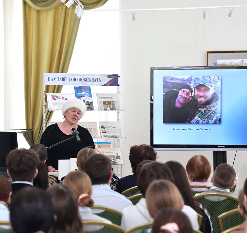 Внимательно слушали участники презентации выступление десантника Алексея Юдина, который приехал с фронта в отпуск; Натальи Ефимовны Чепиной о ее муже Геннадии Васильевиче и сыне Дмитрии Чепиных, находящихся на СВО.